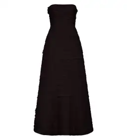 Our Aje Soundscape maxi is a strapless dress with horizontal organza frills throughout. The dress has a fitted bodice with internal boning and a voluminous skirt.