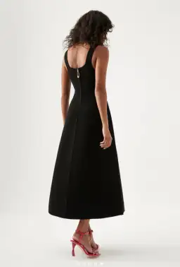 A knit midi dress featuring a fitted underwire bustier, relaxed midi skirt and princess seams through the front. Finished with sculptural details at the bust and zip closure for a signature Aje touch.