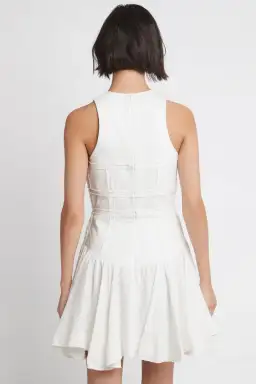 Meet summer's hero white mini dress. Made from a linen blend the Tidal Dress features a racer shaped neckline with corset panelling throughout the fitted bodice with raw cut open seams throughout. Fully lined, the heavy gathering around the skirt gives the piece a light flounce, offering a feminine feel.