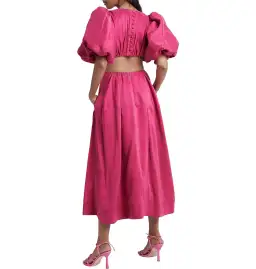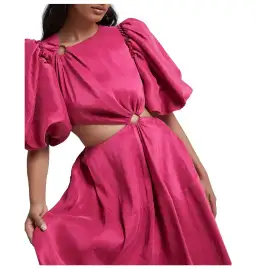 The signature waist cut out detail on this midi dress is accentuated by the voluminous linen blend puff sleeves.