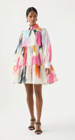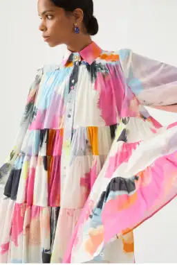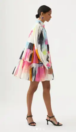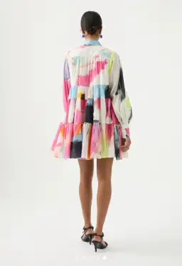The Vie Smock Dress features signature Blouson sleeves, tiered horizontal panels and a classic shirt collar for breezy styling. This is in the Abstract colour