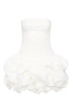 This strapless mini dress radiates modern elegance and bold design. Featuring a ruched bodice that hugs the figure, it creates a sleek and flattering silhouette. The standout feature is the voluminous bubble skirt, crafted from soft, structured fabric that adds playful drama and texture.