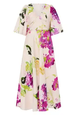 Aje Wild Hydrangea Gilda Bell Sleeve Midi Dress. Size 10 AU. RRP $695. Midi length. Curved v neckline. Gathered bodice. Wide bell short sleeves. Fitted waist. Aline skirt. Side pockets. Lined. Invisible zipper closure. 69% linen; 31% viscose.