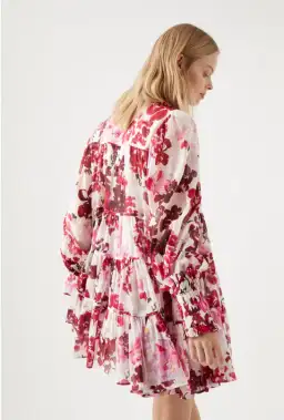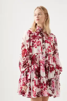 A lightweight cotton voile mini dress in a classic smock shirt silhouette. Pintucked tiers add intricate detailing, creating the perfect elevated daytime to night style.