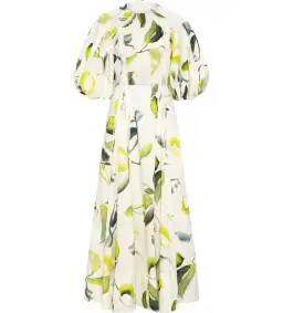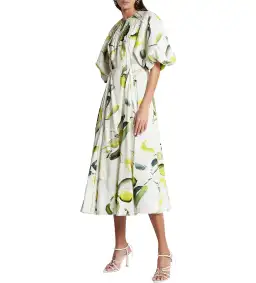 A statement event piece in our energetic house painted lime print, the Zest women's midi dress presents signature Aje puff sleeves, contemporary tailoring and raw edge trims. Imagined in a light linen blend for comfortable summer dressing. Wear with statement pieces or layer with denim for toned down ensembles. This dress has an invisible zipper closure at upper back, side pockets and raw edge trims to highlight seam detail.