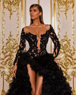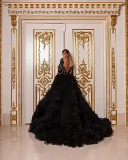 Albina Dyla Black Beaded Bodice Full Tulle Dress featuring a sheer beaded bodice, v-neckline with off-shoulder sleeves and a long tulle skirt with train.