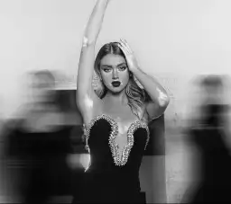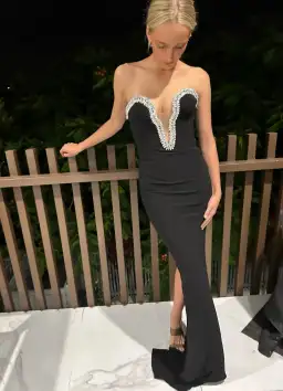 Long simple cut dress, a deep cut on the chest area, designed with square crystals.