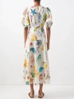 The Alemais white linen Adella dress features a painted Atlantis print with colours of the reef, signature puff sleeves and an empire waist. 100% linen with a hidden back zip. This stunning piece is perfect for all your special occasions!