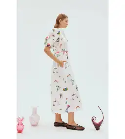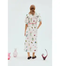 Crafted from a luxe linen fabrication with feminine embroidery, this dress features balloon sleeves with elasticated cuffs, and delicate shell buttons.