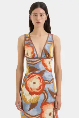 A feminine silhouette cut from our signature midweight linen, in an exclusive SIR. print inspired by ditsy 1990s floral prints. It features a deep v-neckline, soft gathering at the side waist, front split and finished with a contrasting bind detail throughout. Pair it back with heels or sandals for any summer occasion.