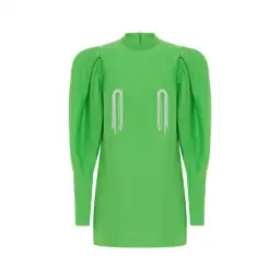 A fitted mini dress with a stand collar, sleeves that have tucks at the shoulder and a shirred panel at the cuff, and an invisible zipper closure at the back. A distinctive feature is the pearl-shaped beaded tassel with baguette jewel ends. It is fully lined and made from a linen-viscose blend
