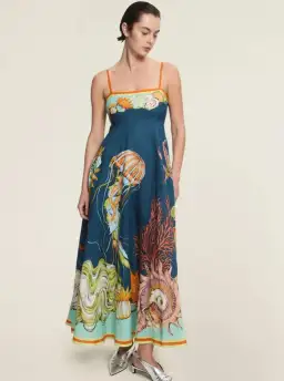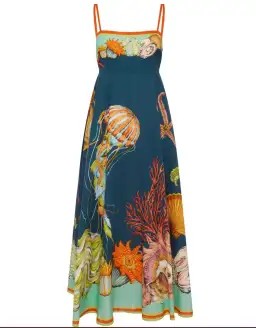 Bring coastal charm to your next event with the ALÉMAIS Dorian Sundress in a dreamy blue sea print, available to rent in size AU 10. This breezy sundress features a square neckline that lend a romantic touch, while adjustable straps ensure a customized fit. The dress is shirred on the back creating a comfortably fitted silhouette around the bust, but then falls gracefully into an A-Line midi‑length skirt giving it movement and whimsical flair. The Dorian Sundress is the perfect pick for garden parties, beachside weddings, or daytime events where you want to feel fresh, feminine, and effortlessly stylish. Renting this dress means you can embrace chic summer elegance—without the commitment.