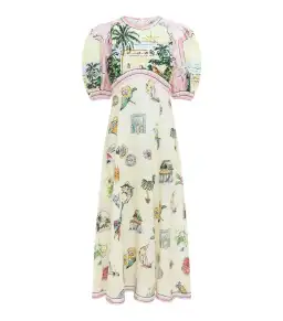 Alemais Sunset Puff-Sleeve Printed Linen Midi Dress Print Size AU 8