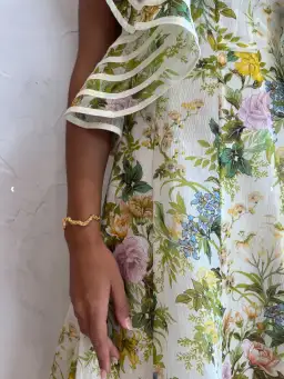 The fabric is lightweight and breezy, with a lining layer underneath making it comfortable and ideal for various occasions. The Eden Flounce Dress showcases a beautiful floral garden print, enhancing its visual appeal. Overall, it's a stylish choice that combines a relaxed, feminine vibe with a touch of elegance.