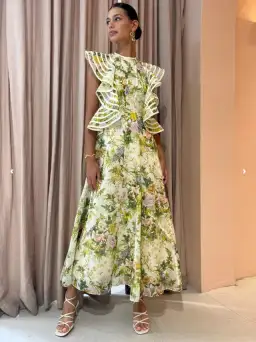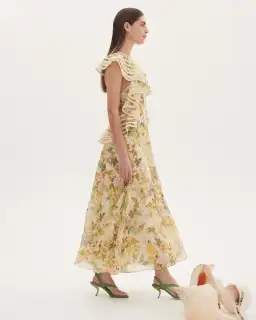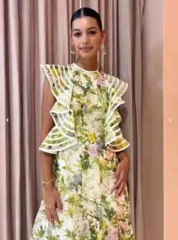 The Alemais Eden Flounce Dress is a chic and feminine piece known for its playful and elegant design. This dress features a flattering silhouette with a fitted bodice and a flared, tiered skirt that adds movement and volume. The "flounce" detail refers to the ruffled or layered accents, which can be found around the neckline, giving the dress a whimsical, yet sophisticated touch.