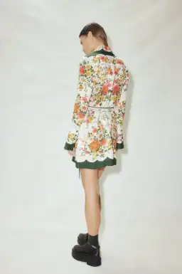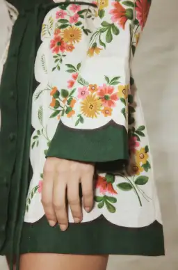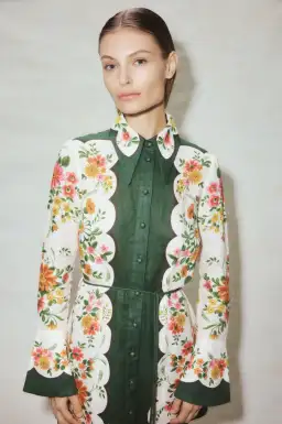 Fitted silhouette, Point collar with stand, Placket with self covered buttons, Slim sleeve featuring slightly flared, shaped cuff with self covered button closure, Back yoke & waist darts, Self tie belt included. Composition: 100% Linen