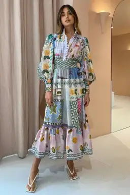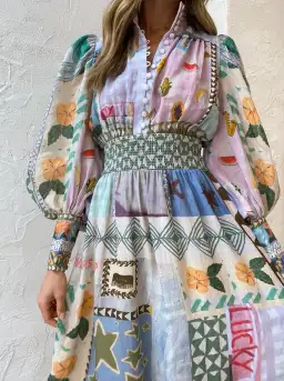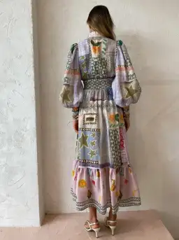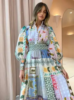 A feminine silhouette designed to form and flatter the femme figure, this shirt dress is crafted from a Ramie fabrication in a stunning conversation starting print and features balloon sleeves, a smocked waist and button fastening through front.