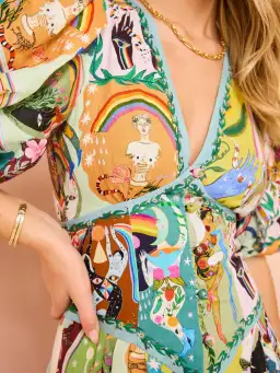 Crafted from a linen fabrication, this midi dress features a V-neck silhouette, and a corseted fitted waist with an eye-catching voluminous sleeve.