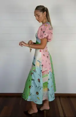 Crafted from European flax linen printed with signature artwork in collaboration with Adam Lester. It features a fitted bodice, an A-line paneled midi skirt and billowed puff sleeves. Simply add sandals to complete the look.
