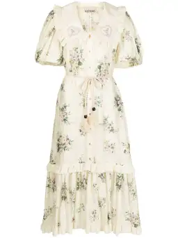Margot floral-print midi dress from ALEMAIS featuring cream, multicolour, cotton-silk blend, all-over floral print, ruffled detailing, frilled collar, front button fastening, short sleeves and tied waist.