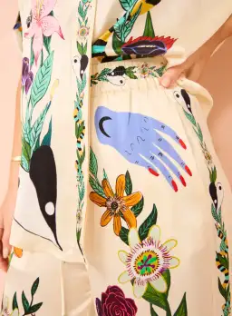 Alemais Artwork in collaboration with artist Meagan Boyd, Relaxed jogger silhouette In seam pockets, High waisted fit, Elasticated waist with ties and toggle ends, Fit is standard, Featured in Alemais debut Runway as part of our Resort ’24 Collection. Composition: 100% Silk Satin Sandwash