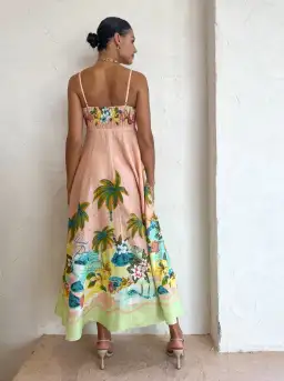 Crafted from fresh linen fabrication, this midi dress features a fitted bodice, floaty silhouette, and square neckline flatter the figure, while adjustable straps and shirred panel at the back add to the style.