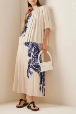 Step out in style with the striking Alemais Rider Pleated Blouse and Skirt Set in a bold, artistic print. Crafted from lightweight, high-quality fabric, this matching set features a beautifully pleated blouse with a structured collar and voluminous pleated sleeves, paired perfectly with a flowy, coordinating midi skirt. Both pieces in Size AU 10 offer a flattering, fashion-forward silhouette that’s ideal for daytime events, creative workspaces, or a stylish brunch. Unique and effortlessly chic, this set brings modern elegance with a playful twist—available to rent now for your next standout moment.