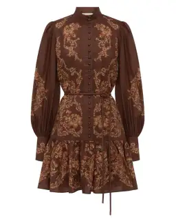 Turn heads with the ALÉMAIS Seraphina Mini Dress in Brown Print, available to rent in size AU 10. This charming mini shirtdress radiates effortless, modern femininity—crafted from breathable ramie with a relaxed silhouette that feels fresh yet refined. It features a high neckline, self-covered button-and-loop front, and long balloon sleeves with button cuffs that add a soft, stylish drama. The dress cinches elegantly at the waist with a self-tie rouleaux belt, flowing into a tiered skirt with a ruffle hem that moves gracefully with you. Thoughtful touches like inseam pockets and optional slip add both practicality and comfort, while the intricate floral-and-paisley-inspired print elevates it into a wearable work of art. Perfect for brunches, garden parties, or daytime events, renting this dress offers a delightful way to embrace bold, feminine style without the commitment.