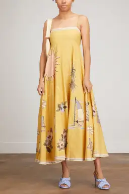 The sun is always shining in Alemais' Sunset Shades Sundress in Sand. Crafted from a Linen fabrication in sunshine yellow, this sundress is designed to fit relaxed on the body for comfort and ease of wear. Featuring a square neckline and empire waist which falls into a free flowing full skirt that finishes at the ankles. Intricate hand-painted motifs of sail boats, palms and the sun spark endless joy will inspire future weekend getaways and long lunch celebrations.