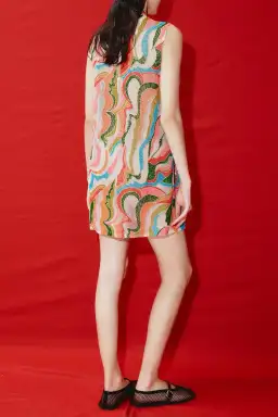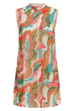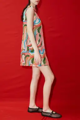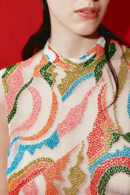 “A psychedelic 70’s inspired cloud scape has been expertly hand beaded by skilled artisans in India to create The Five Beaded Mini Dress. The Five is a nod to the artistic and spiritual collective of Hilma af Klint and their radical experimentation. The piece, worked on during our time with the artisans, is a piece of master craftsmanship. The dress has been delicately beaded with areas of transparency, allowing glimpses of light to emerge through the rainbow of clouds.”