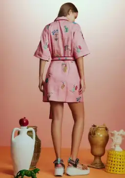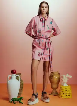 Alémais' 'Timmy' mini dress is printed and embroidered with colourful motifs, designed by multi-disciplinary artist Nadia Hernandez as a celebration of memories and imagination. It's cut from breathable linen in a relaxed shirt-style design with burgundy trims. Use the matching belt to define the waist. This gorgeous little mini can be used for numerous occasions throughout the warmer months.