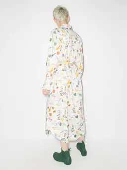 Crafted from white organic cotton, this shirting silhouette is adorned with a colourful print made by the artist and finished with a yellow self-tie belt that cinches the waist for a streamlined look.