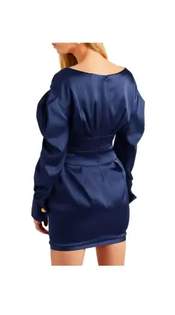 Alexandre Vauthier Navy Satin Mini Dress Size 12 featuring satin, folds, basic solid colour, deep neckline, long sleeves, multipockets, rear closure, zip, fully lined, stretch.