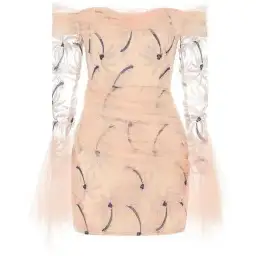Cut with an off-the-shoulder neckline, The All That She Wants Dress has a sheer mesh overlay over the upper arms and bust to help highlight your décolletage. Lurex embroidery, sheer ruching through the waist and exaggerated fluted cuffs all give this mini dress a very luxurious feel.