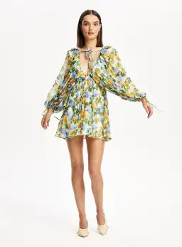 Plunging neckline. Relaxed dolman sleeves. Sheer hydrangea crinkle chiffon. Porcelain lining. Voluminous sleeves with adjustable drawstring at wrists. Low cut back. Thin matching strap that can be tied across the bust. Mini hemline. 100% viscose.