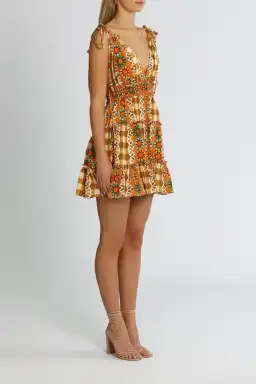 For the ultimate summer day outfit, consider the Clara Mini Dress in Multi by Alice McCall. This dress boasts a unique retro print, a deep V neckline, a tiered skirt, and flattering smocking at the waist.