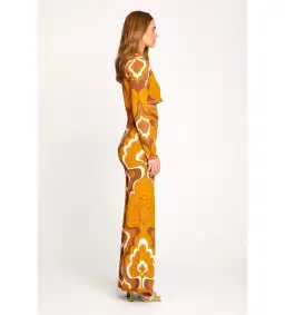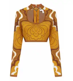 The In Music Top is a cropped knit with long sleeves. It features a scoop neckline with gold detailing, a cut-out front, and a psychedelic print inspired by the 70s.