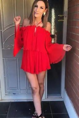 The Locomotion playsuit in red features an off the shoulder design with adjustable shoulder straps, neck detailing and flared sleeves.
