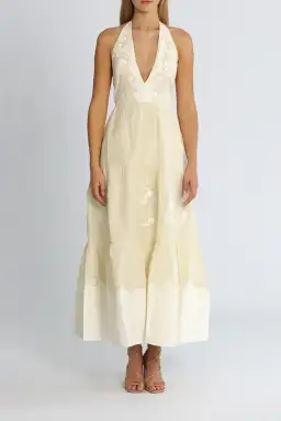 Indulge your romantic side with the lovely Marie Midi Dress in White by Alice McCall. It showcases a deep V neckline and a halter neck tie, creating an elegant look. The dress is tapered at the waist and flows into a gracefully gathered hemline.