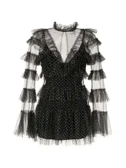 Channeling sophisticated french silhouettes, this black polka-dot tiered dress features a ruffled neck, long sleeves and mini hemline.
