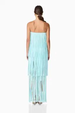 The Alya Tiered Maxi Dress in Blue pairs sleek minimalism with textural detail. Featuring a strapless, fitted bodice and softly tiered skirt, its delicate string overlays add movement and dimension. Crafted in high-stretch fabric and fully lined for comfort, it offers a flattering, structured fit with ease of wear. A hidden side zip ensures a seamless finish. Perfect for formal occasions or evening events, this modern silhouette shines with understated accessories.