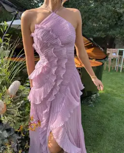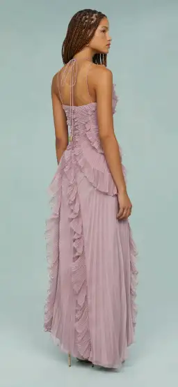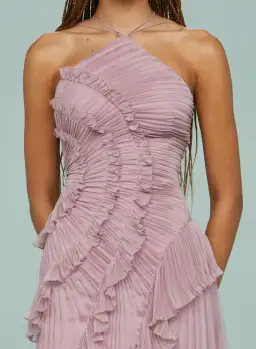In a dreamy dusty lilac, this halter gown is an ode to movement and form. Lily pad-inspired pleating swirls across the bodice, cascading into soft ruffles that mimic water currents.