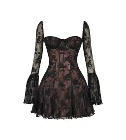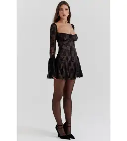 Black lace mini dress with nude underlining. Regular length and regular cups (A-C cup)
