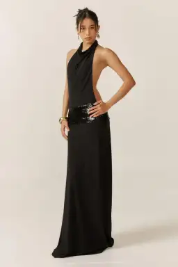 This halter black gown features a draped cowl-neck and an open back. The shimmering sequinned waistband sits low hugging the hips adding textural definition. The fluted skirt drapes asymmetrically, flowing beautifully as you walk.