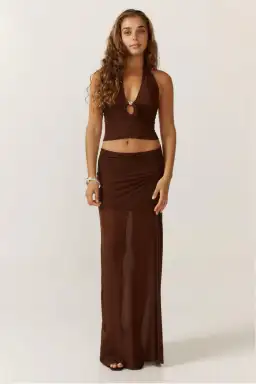 Sleek low halter neckline with striking gold hardware centrepiece, ruched fabric wrapping around it to sculpt and define the waist, the low rise, full length skirt features a pin tuck that flatters the body's figure, double lined around the top.