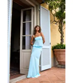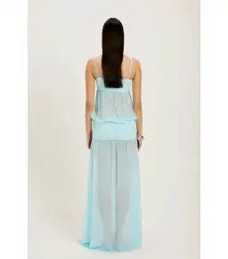 A dreamy blend of structure and softness, with a square neckline, delicate straps, and a fitted waistband flowing into a draped chiffon skirt. The lightweight fabric creates an elegant, fluted silhouette.