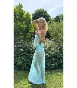 A dreamy blend of structure and softness, with a square neckline, delicate straps, and a fitted waistband flowing into a draped chiffon skirt. The lightweight fabric creates an elegant, fluted silhouette.