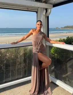 Featuring a waterfall drape that cascades from one shoulder, framing the body with fluid movement. A silver curved oval detail accents the hip, while a high split reveals a floating asymmetrical skirt that moves with effortlessness.