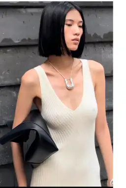 Transeasonal Dressing. Sleeveless V neckline ribbed stretch cotton midi dress with A-line hem. Color is cream