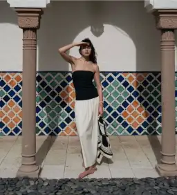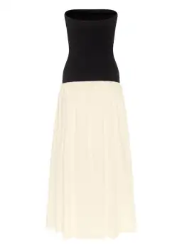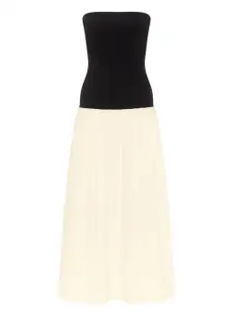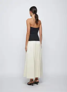 An understated silhouette that celebrates figure and form. This strapless multi media dress is cut in a finely woven cotton poplin, contrasted with a ribbed jersey offering sleek comfort. The design details a bandeau neckline and a drop waist skirt, gathered to create elegant volume. Style for any occasion with the right accessories.